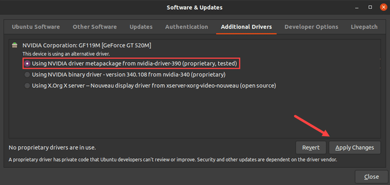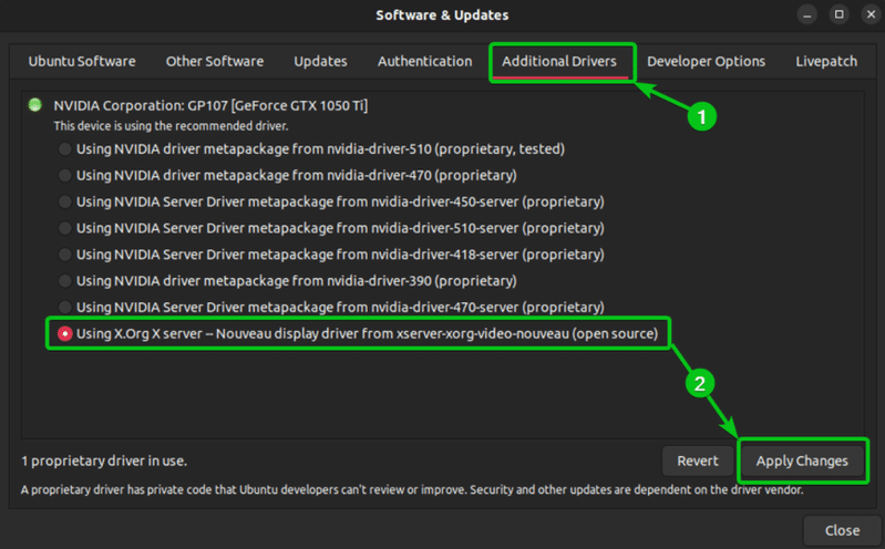 Select the Using X.Org X server – Nouveau display driver from the list on the Additional Drivers tab and then click Apply Changes, as indicated in the image below.