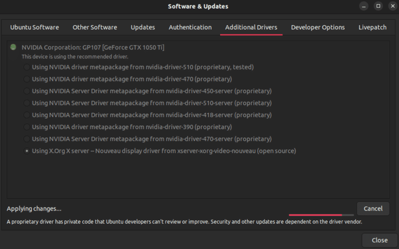 After a successful login, the Software & Updates app will transition to the Nouveau open-source drivers. It’ll take a while to finish.