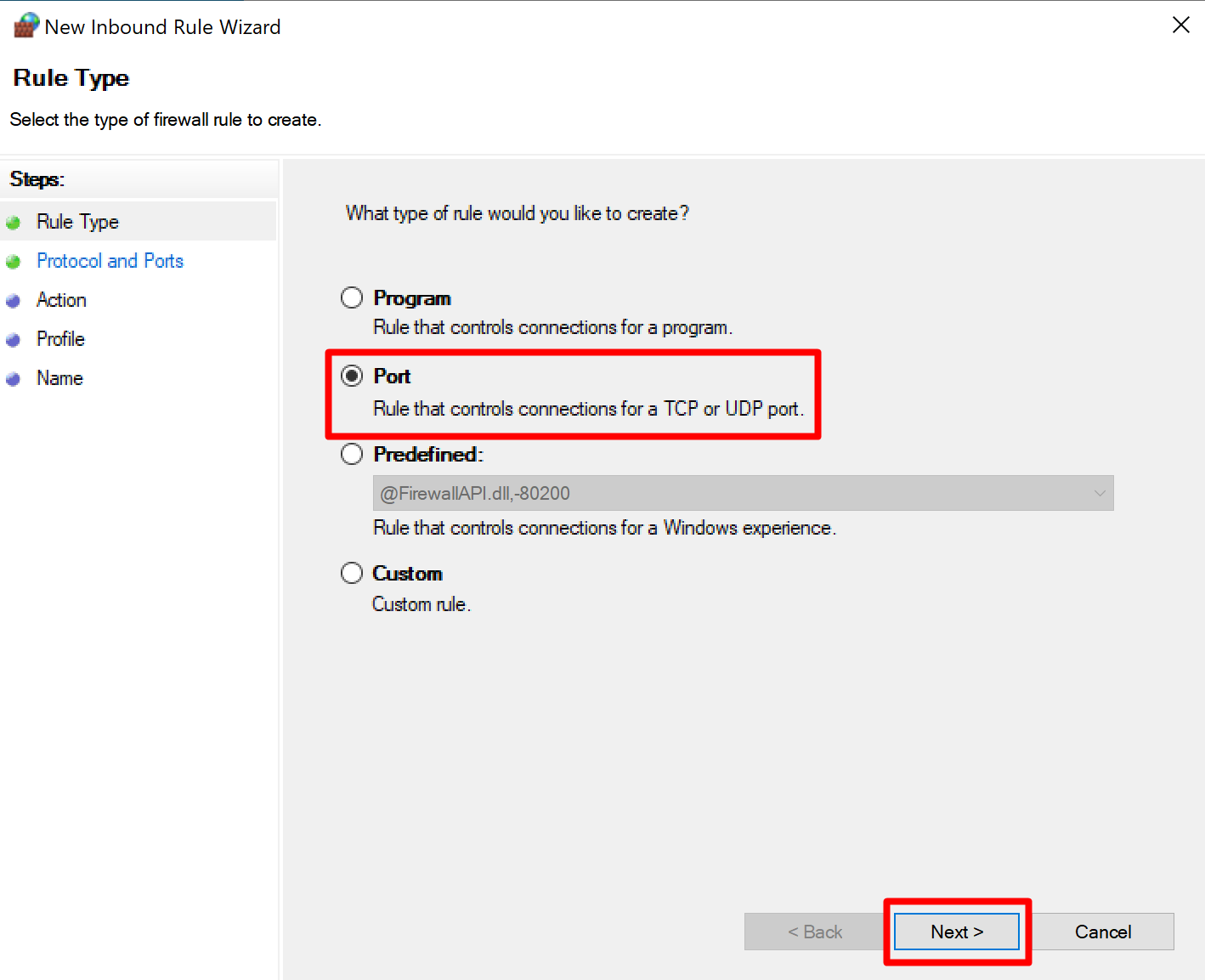- In the “Rule Type” options choose the port and click the Next button.
